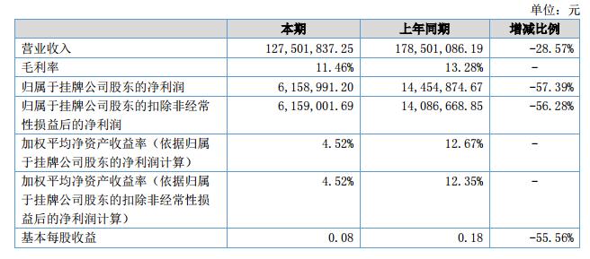 報(bào)告期內(nèi),公司實(shí)現(xiàn)營(yíng)業(yè)收127,501,837.25元,同比減少28.57%;歸屬于掛牌公司股東的凈利潤(rùn)6,153,867.07元,比上年同期減少6,158,991.20元,同比減少57.39%;歸屬于掛牌公司股東的扣除非經(jīng)常性損益后的凈利潤(rùn)6,159,001.69元,比上年同期減少7,927,667.16元,同比減少56.28%;經(jīng)營(yíng)活動(dòng)產(chǎn)生的現(xiàn)金凈流量?jī)纛~為-11,448,382.91元,比上年同期減少了1,642,651.94元。?