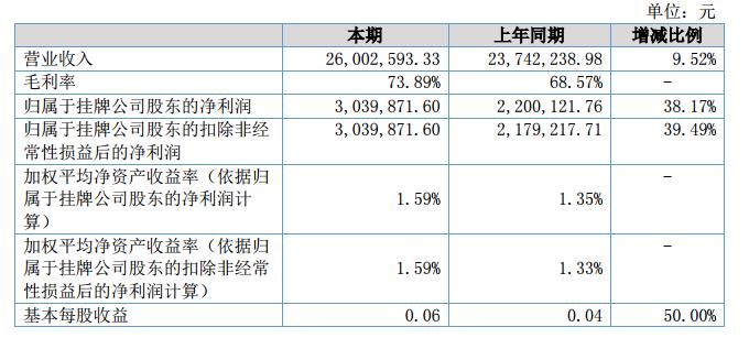報告期內(nèi)公司實現(xiàn)營業(yè)收入2,600.26萬元,較上年同期2,374.22萬元增長9.52%。營業(yè)成本為678.83萬元,較上年同期746.19萬元下降9.03%;凈利潤為273.99萬元,較去年同期220.11增長24.48%。截至2018年6月30日,公司總資產(chǎn)為21,033.10萬元,較本期期初20,791.80增長1.16%;資產(chǎn)負(fù)債率為5.98%,較本期期初下降了0.23個百分點。?