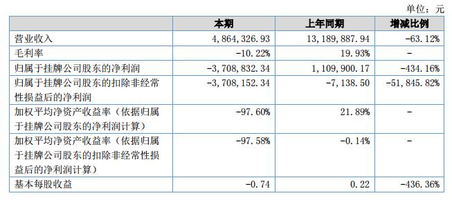 報告期內(nèi)公司實現(xiàn)營業(yè)收入4,864,326.93元,較上年同期下降63.12%;公司實現(xiàn)凈利潤-3,708,832.34元,較上年同期下降434.16%。?