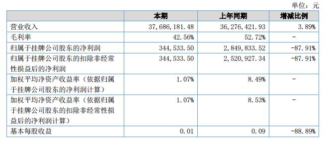 報告期內(nèi),實現(xiàn)銷售收入3768.62萬元,同比上升了3.89%;實現(xiàn)凈利潤為34.45萬元,同比下降87.91%。?