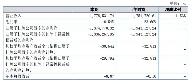 報告期內(nèi)公司實現(xiàn)營業(yè)收入1,778,531.74元,較上年同期增長1.53%;報告期內(nèi)公司產(chǎn)生營業(yè)成本1,662,293.43元,較上年同期增加24.21%;公司實現(xiàn)凈利潤-1,374,770.32元,較上期增加568,356.92元。?