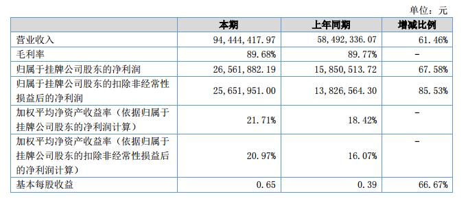 報(bào)告期內(nèi),公司實(shí)現(xiàn)營(yíng)業(yè)收入94,444,417.97元,較上年同期增長(zhǎng)61.46%;報(bào)告期內(nèi),公司利潤(rùn)總額為28,709,873.42元,比上年同期上升69.48%;凈利潤(rùn)26,507,584.14元,比上年同期上升67.28%。?