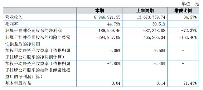 公司實(shí)現(xiàn)營業(yè)收入8,946,921.55元,較上年同期減少4,726,838.19元;營業(yè)成本4,939,710.62元,較上年同期減少4,562,530.18元。?