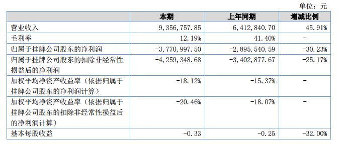 挖貝網(wǎng)9月13日,沃杰森(證券代碼:838550)近日公布的2018年半年報顯示,截至2018年6月30日,企業(yè)實現(xiàn)營收935.68萬元;歸屬于掛牌公司股東的凈利潤為-377.09萬元。