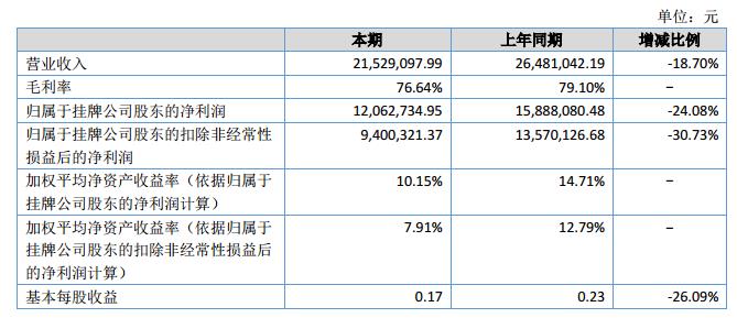 截止2018年6月30日,公司總資產(chǎn)12,469.41萬元,凈資產(chǎn)為9,832.01萬元。2018年上半年,公司實現(xiàn)營業(yè)收入2,152.91萬元,同比減少18.70%,營業(yè)成本502.89萬元,利潤總額和凈利潤分別為1,394.60萬元和1,199.40萬元,較去年同期有所下降。?