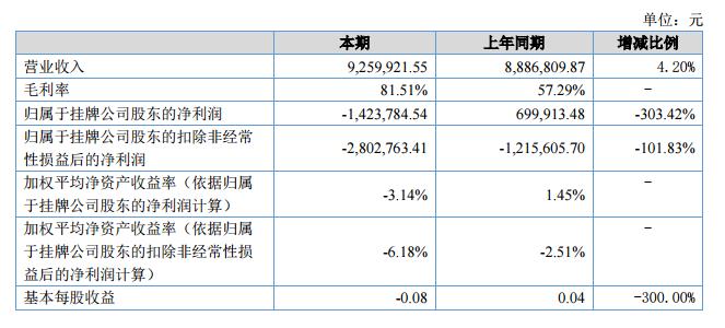 報告期內,公司營業(yè)收入926.00萬元,較上期增加4.2%,營業(yè)成本171.17萬元,較上期減少54.90%,營業(yè)成本降低主要原因系公司報告期內以自產試劑銷售為主,未銷售毛利潤較低的檢測儀器設備,故毛利率較上年同期提高81.51%;本期凈利潤-142.38萬元,較上期減少303.42%,費用增加主要系公司改變銷售模式,引入第三方專業(yè)銷售服務公司,及公司管理層決定2018年開展生殖毒理檢測試劑盒產業(yè)化項目,前期投入費用較多。?
