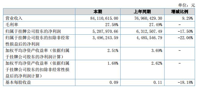 公司累計實現(xiàn)營業(yè)收入84,110,615.00元,同比增長9.29%;實現(xiàn)凈利5,207,970.66元,同比下降17.50%;截止2018年06月30日,公司總資產(chǎn)為318,651,955.07元,同比下降19.73%;凈資產(chǎn)達到209,788,935.48元,同比增長2.09%。?