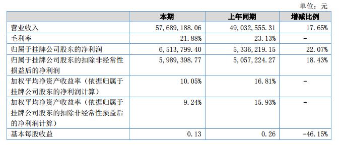 公司在報告期內(nèi)的主營業(yè)務(wù)收入為57,689,188.06元,比上年度同期增長8,656,632.75元;營業(yè)成本為45,067,825.96元,比上年度同期增長7,375,962.93元;歸屬于母公司的凈利潤為6,513,799.40元,比上年度同期增長1,177,580.25元。?