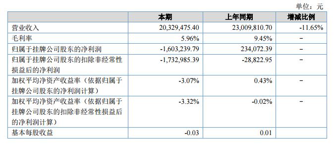 截至報告期末,公司總資產(chǎn)68,342,289.95,較年初增加1.41%、凈資產(chǎn)51,374,475.89較年初減少3.03%。報告期內(nèi),營業(yè)總收入20,329,475.40元,較上年同期減少11.65%,營業(yè)總成本19,117,722.44元,較上年同期下降8.24%,凈利潤-1,603,239.79元,較上年同期減少702.21%。?