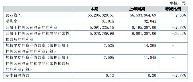 報(bào)告期內(nèi),公司實(shí)現(xiàn)營(yíng)業(yè)收入5,520.63萬元,與上年同期相比減少了2.35%;營(yíng)業(yè)總成本4,979.49萬元,與上年同期相比增加0.56%;實(shí)現(xiàn)凈利潤(rùn)509.12萬元,與上年同期相比減少了37.88%。?