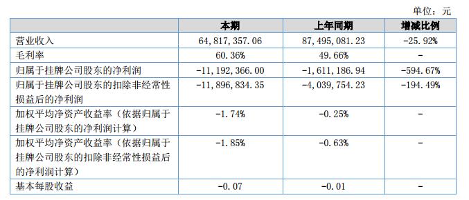 報告期內(nèi),公司實現(xiàn)營業(yè)收入64,817,357.06元,上年同期實現(xiàn)營業(yè)收入87,495,081.23元,同比下降25.92%;毛利率由上年同期49.66%上升至本期60.36%;歸屬于掛牌公司股東的凈利潤-11,192,366.00元,上年同期歸屬于掛牌公司股東的凈利潤為-1,611,186.94元,同比虧損增加594.67%。?