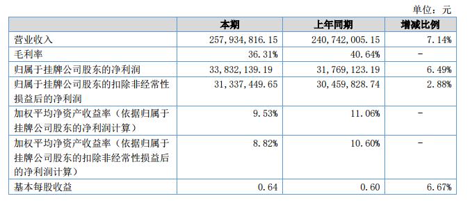 報(bào)告期內(nèi),公司實(shí)現(xiàn)營(yíng)業(yè)收入25,793.48萬(wàn)元,較上年同期增長(zhǎng)7.14%,營(yíng)業(yè)成本為16,537.22萬(wàn)元,較上年同期增長(zhǎng)了14.49%;凈利潤(rùn)為3383.21萬(wàn)元,較去年同期增長(zhǎng)6.49%。截至2018年6月30日公司總資產(chǎn)為63,355.70萬(wàn)元,較期初增長(zhǎng)7.47%;資產(chǎn)負(fù)債率為41.30%,較期初下降1.29%。?