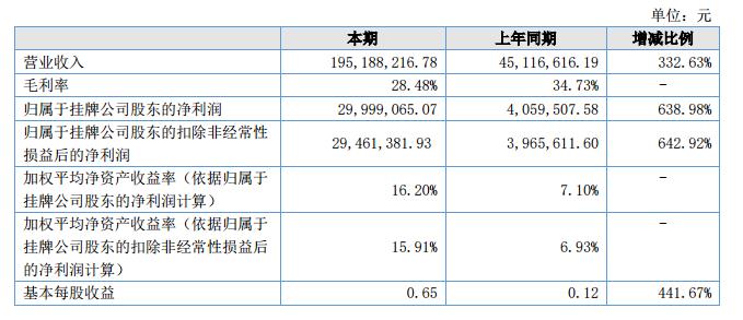 公司在報(bào)告期內(nèi)的主營(yíng)業(yè)務(wù)收入為195,188,216.78元,比上年度同期增長(zhǎng)332.63%;營(yíng)業(yè)成本為139,589,388.33元,比上年度同期增長(zhǎng)374.04%;凈利潤(rùn)為29,999,065.07元,比上年度同期增長(zhǎng)638.98%。?