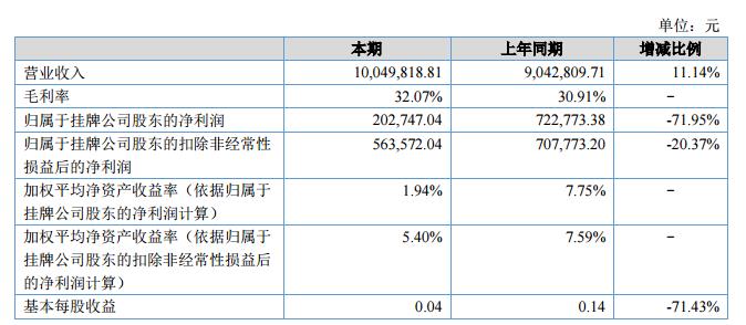 公司實(shí)現(xiàn)營業(yè)收入1,004.98萬元,較去年同期增長11.14%;公司實(shí)現(xiàn)凈利潤20.27萬元,較去年同期減少71.95%。?