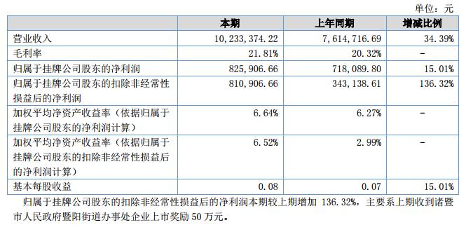 上半年實現(xiàn)營業(yè)收入10,233,374.22元,上年同期實現(xiàn)收入7,614,716.69元,同比增加34.39%,主要原因為:公司廣告牌設計制作和發(fā)布收入增長幅度加大,本期實現(xiàn)收入8,674,506.30元,較上年同期增長1155.30%;上半年公司實現(xiàn)凈利潤825,906.66元,上年同期實現(xiàn)凈利潤718,089.80元,同比增加15.01%。?