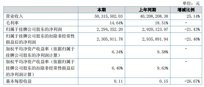 報告期內(nèi),公司經(jīng)營狀況良好,業(yè)績持續(xù)穩(wěn)定增長,實現(xiàn)營業(yè)收入50,315,502.03元,較上年同期增長了25.14%;凈利潤2,294,352.20元,較上年同期下降了21.43%;經(jīng)營活動產(chǎn)生的現(xiàn)金凈流入373,417.61元,較上年同期增加流入7,675,148.61元;投資活動產(chǎn)生的現(xiàn)金凈流出為1,076,795.88元,較上年同期增加流出484,691.49元;籌資活動產(chǎn)生的現(xiàn)金凈流出為233,297.77元,較上年同期減少流入7,825,889.67元。?