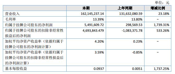 公司實(shí)現(xiàn)營業(yè)收入162,145,237.14元,比上年同期增加30,513,156.55元,增加23.18%;報(bào)告期內(nèi),營業(yè)成本140,432,971.44元,比上年同期增加26,961,297.74元,增加23.76%;公司實(shí)現(xiàn)凈利潤5,491,609.72元,比上年同期增加5,193,040.19元,增加1739.31%。?