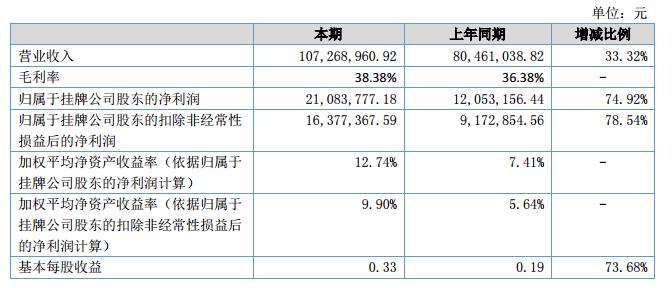 報(bào)告期內(nèi)公司財(cái)務(wù)狀況良好,營業(yè)收入大幅增加,盈利能力明顯增強(qiáng),現(xiàn)金流充足,資產(chǎn)負(fù)債率低。報(bào)告期內(nèi),公司實(shí)現(xiàn)營業(yè)收入10,726.90萬元,較上年同期增加2,680.80萬元,同比增長33.32%;實(shí)現(xiàn)凈利潤2,102.70萬元,較上年同期增加899.90萬元,同比增長74.82%。?