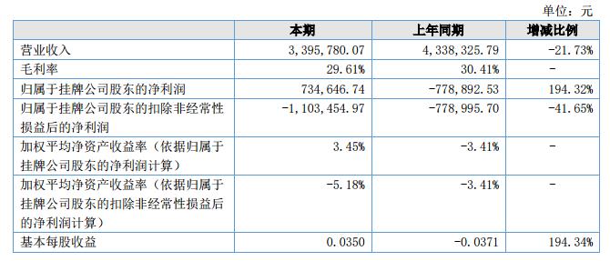 2018年1-6月份實(shí)現(xiàn)銷售收入3,395,780.07元,比上年同期4,338,325.79元減少942,545.72元,較去年同期減少21.73%。主要原因是公司在國家環(huán)保力度增加,客戶經(jīng)營環(huán)境變化,造成了上半年度客戶購買力的下降所致。2018年1-6月份發(fā)生營業(yè)成本2,373,106.84元,比上年同期2,818,608.27元減少445,501.43元,較去年同期下降15.81%。主要是銷售額減少引起的成本減少。2018年1-6月實(shí)現(xiàn)凈利潤457,191.34元,比去年同期凈利潤-889,779.61元增加1,346,970.95元,較去同期增加151.38%。主要原因是報(bào)告期內(nèi)公司母公司收到三板上市政府補(bǔ)貼2,500,000.00元,營業(yè)外收入大幅增加,增厚了公司凈利潤。?