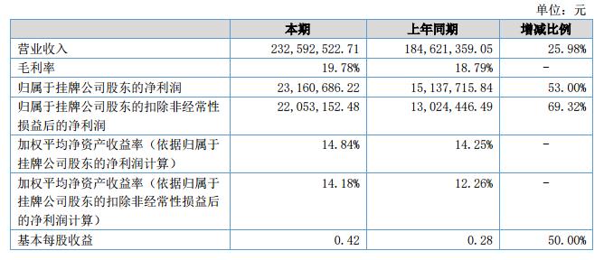 報告期內公司經(jīng)營成果情況:2018年1月至6月營業(yè)收入232,592,522.71元,較上年同期184,621,359.05元增長47,971,163.66元,增長百分比為25.98%;2018年1月至6月營業(yè)成本186,594,294.96元,較上年同期149,932,487.58元增加36,661,807.38元,增長比例為24.45%;2018年1月至6月毛利率為19.78%,較上年同期18.79%增長0.99%;2018年1月至6月凈利潤為23,160,686.22元,較上年同期15,137,715.84元增長8,022,970.38元,增長比例為53.00%。?