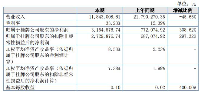 報(bào)告期內(nèi)公司實(shí)現(xiàn)營(yíng)業(yè)收入11,843,008.61元,較上年同期減少9,947,261.74元,同比下降45.65%;報(bào)告期內(nèi)公司營(yíng)業(yè)成本為7,907,233.20元,較上年同期減少12,114,268.31元,同比下降57.78%;報(bào)告期內(nèi)公司實(shí)現(xiàn)凈利潤(rùn)3,154,876.74元,較上年同期增加2,382,801.82元,同比增長(zhǎng)308.62%。?