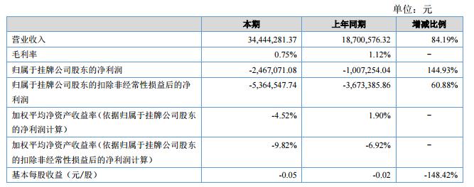 報(bào)告期內(nèi)發(fā)生營(yíng)業(yè)成本3,418.48萬元,較上年同期1,849.06萬元增長(zhǎng)84.88%,增長(zhǎng)主要原因是公司報(bào)告期實(shí)現(xiàn)營(yíng)業(yè)收入大幅增加營(yíng)業(yè)成本相應(yīng)增長(zhǎng)所致。報(bào)告期實(shí)現(xiàn)凈利潤(rùn)-246.71萬元,較上年同期-100.73萬元增長(zhǎng)-144.93%。?