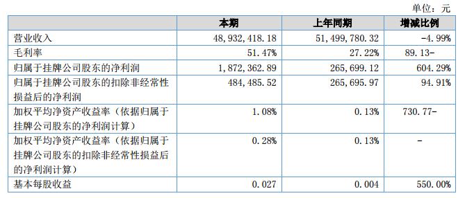 本報告期內(nèi),公司營業(yè)收入48,932,418.18元,同比下降4.98%,營業(yè)利潤為1,107,814.47元,同比增加256.22%。?