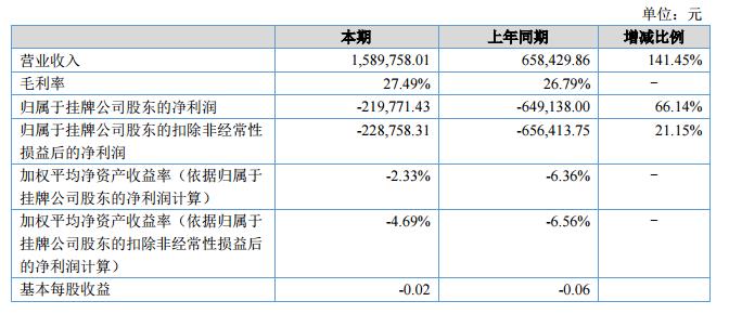 報告期內(nèi),本公司營業(yè)收入和歸屬于掛牌公司股東的凈利潤同比有較大增長,公司實現(xiàn)營業(yè)收入1,589,758.01元;歸屬于掛牌公司股東的凈利潤-219,771.43元,較上年同期增長66.14%,主要原因是由于公司的銷售收入有所增加,在成本控制方面加強管理;凈資產(chǎn)為9,448,266.98元,較期初凈資產(chǎn)減少2.27%;另一方面成本與銷售費用也較上期分別增長139.13%和199.66%。隨著公司業(yè)務量的增加和銷售范圍的擴大,相應負債較年初也明顯增加;經(jīng)營活動產(chǎn)生的現(xiàn)金流量凈額942,323.12元,上年同期為4,936,443.61元,下降80.81%,主要是由于本期公司購買的銀行理財產(chǎn)本未到期。?