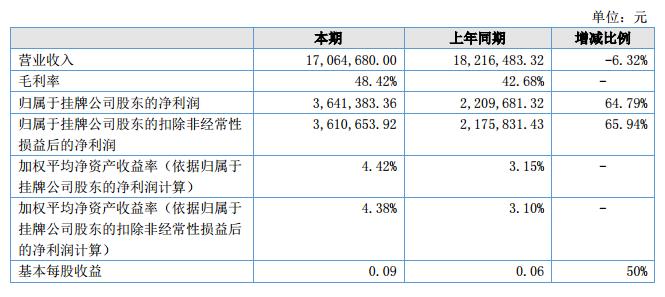 2018年上半年,公司實現(xiàn)合并營業(yè)總收入17,064,680.00元,同比減少了6.32%;合并凈利潤3,641,383.36元,同比增長64.79%。報告期末,公司總資產(chǎn)100,849,672.96元,較年初增長3.98%;負債合計16,666,491.35元,較年初增長1.33%;所有者權益84,183,181.61元,較年初增長4.52%。?