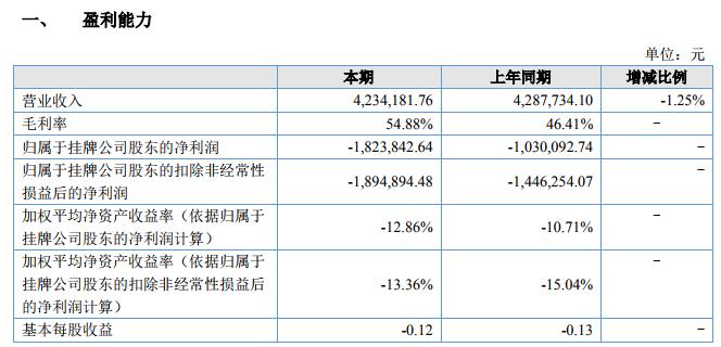 截至報(bào)告期末,公司資產(chǎn)總額為 3,694.31 萬元,較期初增加 92.27 萬元,增幅 2.56%;公司負(fù)債總額為 2,367.47 萬元,較期初增加 274.65 萬元,增幅為 13.12%;凈資產(chǎn)總額為 1,326.84 萬元,較期初減少 182.38 萬元,降幅 12.08%。