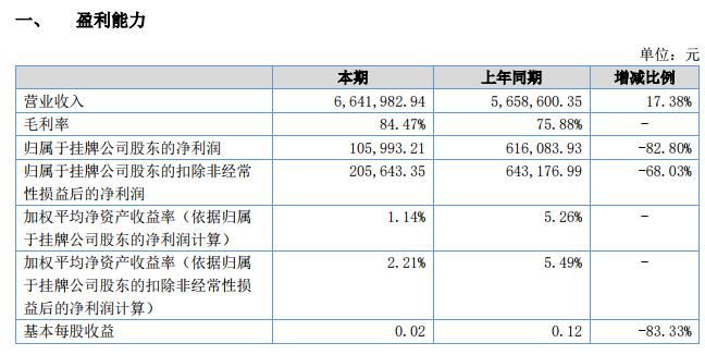 報(bào)告期內(nèi),公司完成營(yíng)業(yè)收入 6,641,982.94 元,較上年同期上漲 17.38%,營(yíng)業(yè)總成本 6,408,008.51 元,較上年同期上漲 32.63%,實(shí)現(xiàn)凈利潤(rùn) 114,079.12 元,較上年同期下降 81.48%。截止 2018 年 6 月 30 日,公司總資產(chǎn) 11,045,573.45 元,較上年期末增長(zhǎng) 2.66%,凈資產(chǎn) 9,348,419.46 元,較上年期末增長(zhǎng) 1.15%。投資收益 9,117.75 元。