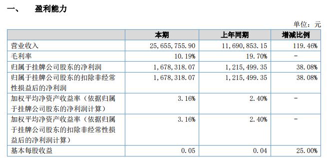 2018 年上半年,公司實(shí)現(xiàn)營業(yè)收入 25,655,755.90 元,較上年同期增加 13,964,902.75 元,增加比例為 119.46%;凈利潤為 1,678,318.07 元,較上年同期增加 462,818.72 元,增加比例為 38.08%;截至 2018 年 6 月 30 日,公司總資產(chǎn)為 56,335,480.18 元,較期初余額減少 3,931,383.63 元,減少比例為 6.53%;負(fù)債合計(jì)為 2,461,506.31 元,較期初余額減少 5,609,701.70 元,減少比例為 69.51%;凈資產(chǎn)為 17,156,676.48 元,較期初余額增加 1,510,486.26 元,增加比例為 9.66%。本報(bào)告期內(nèi)經(jīng)營活動產(chǎn)生的現(xiàn)金流量凈額為-1,354,821.31 元,上期為-3,551,354.87 元,增長幅度為 61.85%。