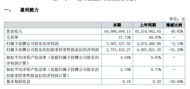2018 年上半年公司簽訂的合同保持穩(wěn)定,實(shí)現(xiàn)營業(yè)收入 6,408.87 萬元,營業(yè)成本 3,990.74 萬元,凈利潤 398.74 萬元;上年同期營業(yè)收入 4,551.01 萬元,營業(yè)成本 2,727.48 萬元,凈利潤 407.45 萬元;本期與上年同期相比分別增長 40.82%、46.32%及-2.14%。營業(yè)收入與去年同期增長較大的主要原因是本報(bào)告期的生產(chǎn)經(jīng)營規(guī)模較去年擴(kuò)大,完工驗(yàn)收項(xiàng)目比去年同期增多;營業(yè)成本增加較多的主要原因是原材料成本及直接人工成本上升;凈利潤下降的主要原因是制造成本增長,員工增加及工資水平上升導(dǎo)致期間費(fèi)用增加較多,研發(fā)費(fèi)用比去年同期增長較多。