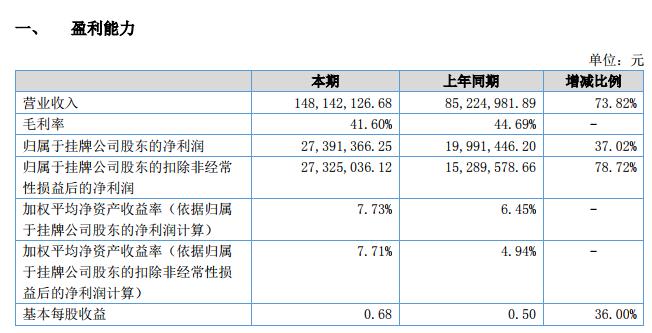 報告期內,公司實現(xiàn)營業(yè)收入 148,142,126.68 元,同比增長 73.82%,主要原因系受國家環(huán)保政策影響,公司訂單增長所致;凈利潤 27,429,292.60 元,同比增長 38.48%,主要原因系報告期內公司營業(yè)收入增長所致;截至 2018 年 6 月 30 日,公司總資產為 535,685,773.93 元,同比增長 2.94%,歸屬于掛牌公司股東的凈資產 366,020,765.74 元,同比增長 6.83%;經營活動產生的現(xiàn)金流量金額 -21,713,628.08,同比減少-1,264.85%,主要原因系隨著營業(yè)收入及訂單增加,公司存貨、采購需求增加,支付貨款增加,同時受回款周期和安裝進度的影響,公司銷售回款未同比例增加所致。報告期內,公司不斷加強研發(fā)隊伍建設,引進創(chuàng)新性人才,提高工藝水平,繼續(xù)保持行業(yè)領