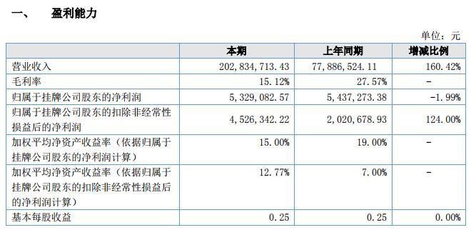 報告期內(nèi),公司實現(xiàn)營業(yè)收入 2.03 億元,比去年同期增加 160.42%;歸屬于掛牌公司股東的凈利潤 532.91 萬元;總資產(chǎn)為 1.22 億元,同比增加 2.70%;經(jīng)營活動產(chǎn)生的現(xiàn)金流凈額為 36.62 萬元。報告期內(nèi),公司經(jīng)營發(fā)展勢頭良好,主要體現(xiàn)在以下幾個方面: