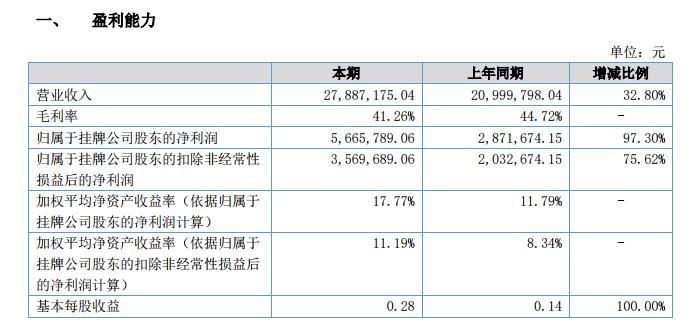 報(bào)告期內(nèi)實(shí)現(xiàn)營業(yè)收入27,887,175.04元,較上年同期20,999,798.04元,增長32.80%。報(bào)告期內(nèi)實(shí)現(xiàn)凈利潤5,665,789.06元,較上年同期2,871,674.15 元,增長97.30%。報(bào)告期末資產(chǎn)總額61,441,858.98元,較期初54,109,668.58元,增長13.55%。報(bào)告期末凈資產(chǎn)34,817,259.08元,較期初29,059,267.93元,增長19.81%。