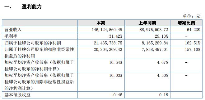 上半年實(shí)現(xiàn)營(yíng)業(yè)收入 14,612.46 萬(wàn)元,比上年同期 8,897.55 萬(wàn)元增長(zhǎng) 64.23%,實(shí)現(xiàn)產(chǎn)品毛利 4,591.23 萬(wàn)元,毛利率 31.42%,實(shí)現(xiàn)歸屬于掛牌公司股東的凈利潤(rùn) 2,143.57 萬(wàn)元,比上年同期 816.53 萬(wàn)元增長(zhǎng) 162.51%。