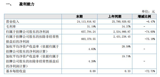 報告期內(nèi),營業(yè)收入 24,113,816.92 元,同比減少 1,667,103.10 元,下降 6.47%。下降主要原因為公司報告期內(nèi)國內(nèi)銷售同比增長 21.84%,出口銷售同比下降 61.96%,系國外訂單正式下單較晚所致;營業(yè)成本 16,593,260.77 元,同期下降 1.94%,主要系收入下降導(dǎo)致成本下降;凈利潤為 657,794.24 元,同比減少 1,877,106.63 元,下降 74.05%,下降主要原因為報告期內(nèi)出口銷售下降 61.96%,導(dǎo)致報告期收入下降,其他收益增值稅退還同比下降 50.30%。