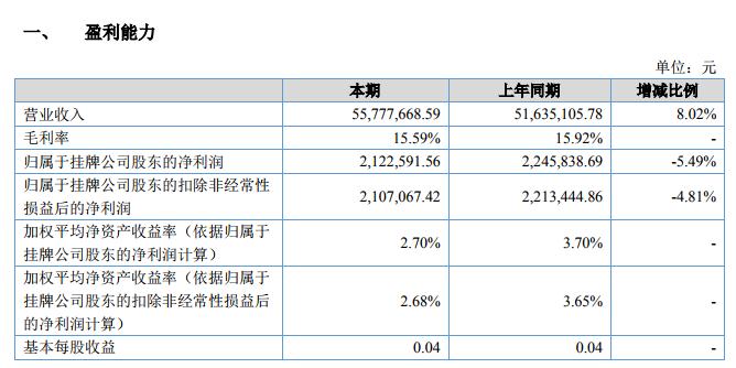 報告期內(nèi)公司營業(yè)收入 55,777,668.59 元,與上年同期相比增長了 8.02%;銷售毛利率為 15.59%,與上年同期相比下降了 0.33 個百分點(diǎn);本期實(shí)現(xiàn)凈利潤 2,103,204.56 元,比上年同期相比減少了 7.08%。本期經(jīng)營活動產(chǎn)生的現(xiàn)金流量凈額為-7,886,153.68 元,較上年同期減少了 3,969,375.03 元。