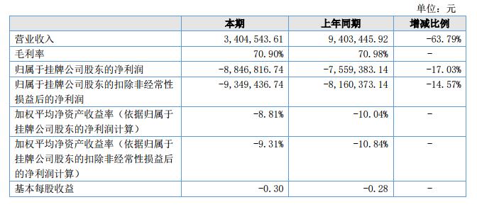 報告期內(nèi),營業(yè)收入340.45萬元,同比下降63.79%,營業(yè)利潤是-960.64萬元,同比去年同期下降了20.23%,歸屬于公司股東的凈利潤-884.68萬元,同比下降17.03%。?