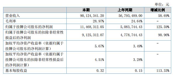 報(bào)告期內(nèi),公司實(shí)現(xiàn)營業(yè)收入90,124,341.20元,較上年同期增加33,330,852.20元,同比增長58.69%;本期實(shí)現(xiàn)利潤:11,468,312.05元,比去年同期增長125.59%。?