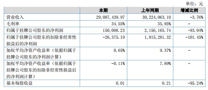 公司2018年上半年度實(shí)現(xiàn)為營(yíng)業(yè)收入2,908.74萬(wàn)元,較上年同期下降了3.76%;實(shí)現(xiàn)凈利潤(rùn)15.00萬(wàn)元,較上年同期下降了93.04%,凈利潤(rùn)下降的主要是同比營(yíng)業(yè)收入減少、銷售費(fèi)用增加等原因引起的??鄢墙?jīng)常性損益后的凈利潤(rùn)為-2.64萬(wàn)元,較上年同期下降了101.45%。報(bào)告期末總資產(chǎn)4,588.19萬(wàn)元,總資產(chǎn)增長(zhǎng)率為9.00%;凈資產(chǎn)2,320.01萬(wàn)元,凈資產(chǎn)的增長(zhǎng)率為0.65%;經(jīng)營(yíng)活動(dòng)產(chǎn)生的現(xiàn)金流量?jī)纛~69.29萬(wàn)元,比去年同期下降88.97%。?