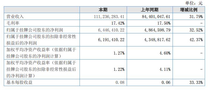 報告期內(nèi),實現(xiàn)營業(yè)收入11,123.63萬元,同比增長31.79%;實現(xiàn)歸屬于掛牌公司股東的扣非后凈利619.14萬元,同比增長42.37%。報告期末,公司的總資產(chǎn)為20,149.97萬元,同比增長16.50%;凈資產(chǎn)13,023.30萬元,同比增長5.21%。?