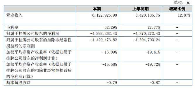 公司在報告期內(nèi)的主營業(yè)務收入為6,122,926.98元,比上年同期5,420,135.75元增加12.97%;營業(yè)成本為2,921,526.19元,比上年同期3,915,204.78元減少25.38%;凈利潤為-4,292,262.43元,比上年同期-4,370,272.43元,虧損減少78,010.00元?