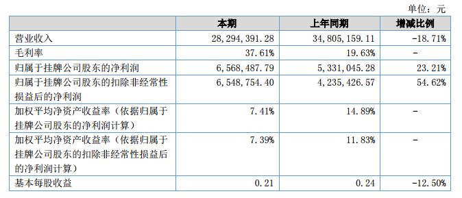 報告期內(nèi),公司實現(xiàn)營業(yè)收入28,294,391.28元,較上年同期下降18.71%,營業(yè)收入的下降主要是公司調(diào)整了產(chǎn)品結(jié)構(gòu),市場銷售主要以高附加值產(chǎn)品為主,同時取消了貿(mào)易板塊的銷售。公司實現(xiàn)凈利潤6,568,487.79元,較上年同期增長23.21%,凈利潤的增加主要是產(chǎn)品銷售價格上調(diào),生產(chǎn)成本由于實施了技改呈下降趨勢,期間費用占銷售收入比重減少所致。?
