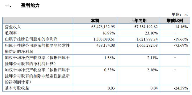 凈利潤分析:本期實現(xiàn)凈利潤為 130.31 萬元,上年同期為 162.20 萬元,減少 31.89 萬元,同比下降 19.66%,凈利潤下降的原因營業(yè)利潤下降所致。營業(yè)利潤下降的主要原因是本期產(chǎn)品的毛利率下降,本期毛利率為 16.97%,比上年同期的 23.10%,下降 6.13%。本期客戶要求產(chǎn)品降價,產(chǎn)品平均降價約 3%,同時原材料價格與上年同期對比上漲約 5%,產(chǎn)品降價和原材料漲價是毛利率降低的主要原因。