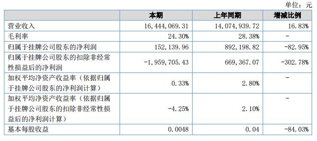 報(bào)告期內(nèi),公司實(shí)現(xiàn)營(yíng)業(yè)收入16,444,069.31元,同比增長(zhǎng)16.83%,實(shí)現(xiàn)凈利潤(rùn)152,139.96元(扣除非經(jīng)常性損益后的凈利潤(rùn)為-1,959,705.43元),凈利潤(rùn)下降主要原因:1)毛利率下降:公司毛利率下降至24.30%,主要由于公司國(guó)外出口額下降,國(guó)內(nèi)銷售穩(wěn)步增長(zhǎng),但國(guó)內(nèi)銷售產(chǎn)品毛利率低于國(guó)外銷售毛利率,從而導(dǎo)致公司整體毛利率下降。2)費(fèi)用上升:公司銷售費(fèi)用同比上升108.69%,主要由于公司為擴(kuò)展國(guó)內(nèi)市場(chǎng),從2017年下半年開始增加銷售人員、增加廣告投入導(dǎo)致;研發(fā)費(fèi)用同比上升142.67%,主要由于公司增加了“一種家用或小型商用變頻調(diào)速自動(dòng)恒溫?zé)岜霉┡瘷C(jī)組”、“一種低環(huán)境溫度熱泵集中供暖系統(tǒng)”等項(xiàng)目的研發(fā)投入。?