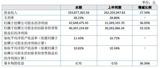 公司實(shí)現(xiàn)營(yíng)業(yè)收入33,387.74萬(wàn)元,同比上升27.34%。公司實(shí)現(xiàn)凈利潤(rùn)4,264.95萬(wàn)元,同比上升36.05%;歸屬于掛牌公司股東的凈利潤(rùn)4,264.95萬(wàn)元,同比上升36.05%,歸屬于掛牌公司股東的扣除非經(jīng)常性損益的凈利潤(rùn)4,034.72萬(wàn)元,同比上升33.31%,凈利潤(rùn)的增長(zhǎng)主要系營(yíng)業(yè)收入增長(zhǎng)所致。?