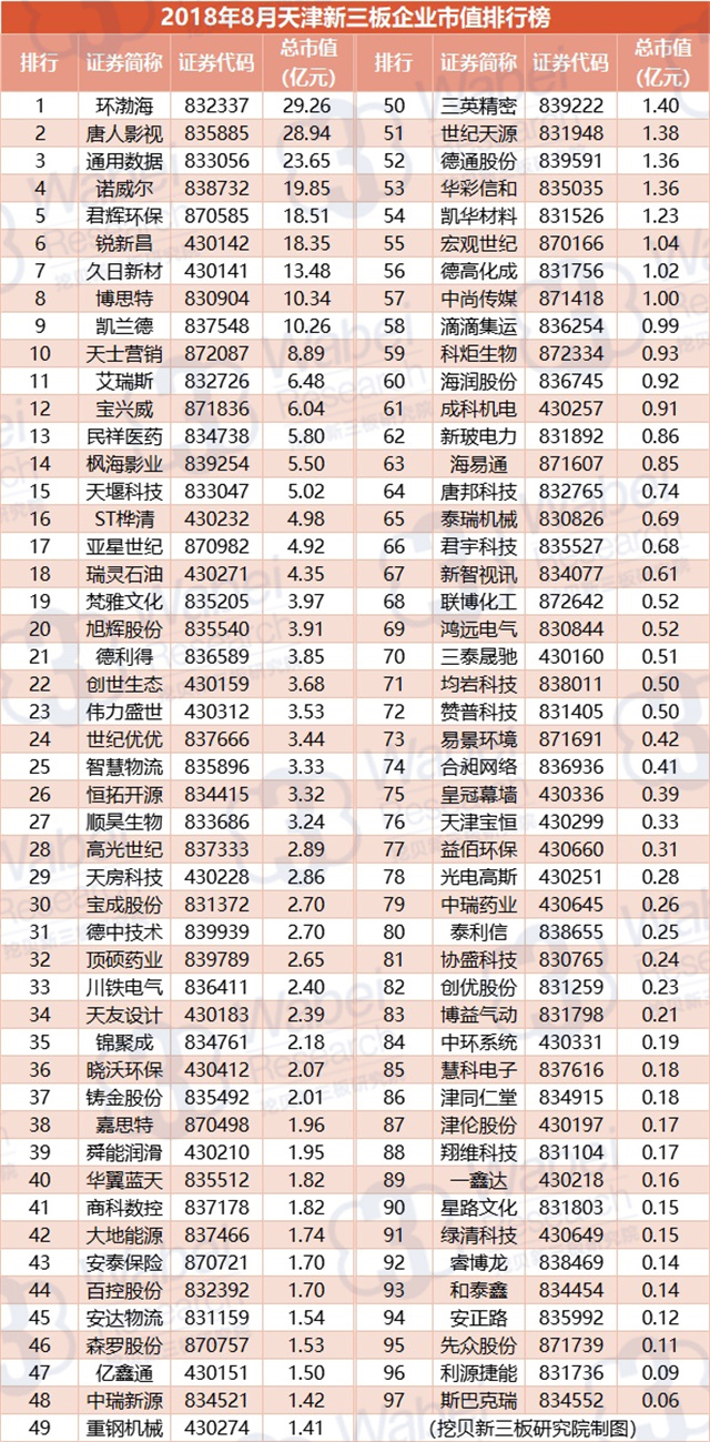 附:2018年8月天津新三板企業(yè)市值排行榜