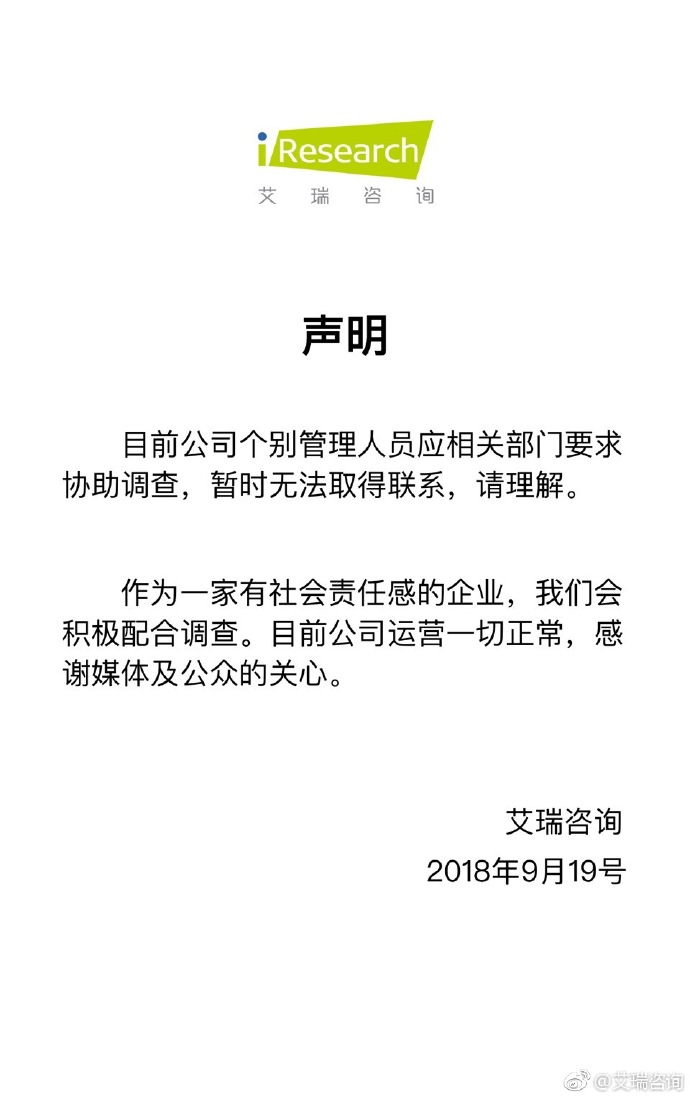 對此,艾瑞咨詢通過官方微博發(fā)布聲明,目前公司個(gè)別管理人員應(yīng)相關(guān)部分要求協(xié)助調(diào)查,暫時(shí)無法取得聯(lián)系,請理解。作為一家有社會責(zé)任感的且有,我們會積極配合調(diào)查,目前公司運(yùn)營一切正常,感謝媒體及公眾的關(guān)心。
